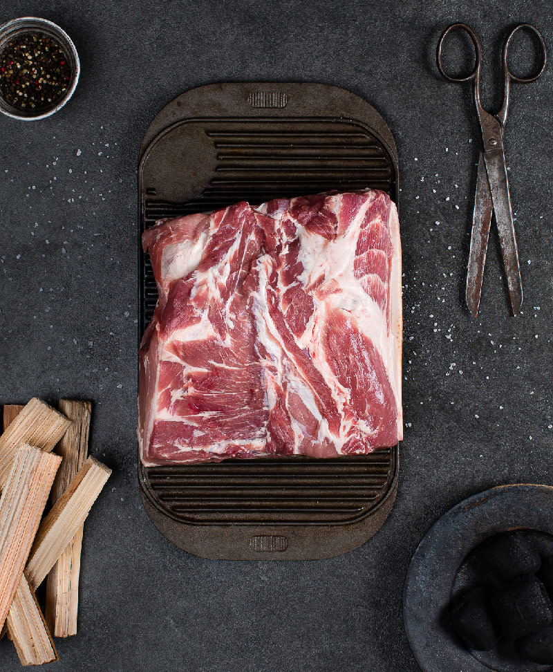 Pork Boston Butt. Also known as the pork shoulder top end cut, it has the blade bone intact and for very good reason, as when cooked well the blade bone should pull out with ease, cooked low and slow for pulled pork. Popular Pit Master cut as it combines the rich juices with added rubs and the smoky flavour. Also a great oven roast.