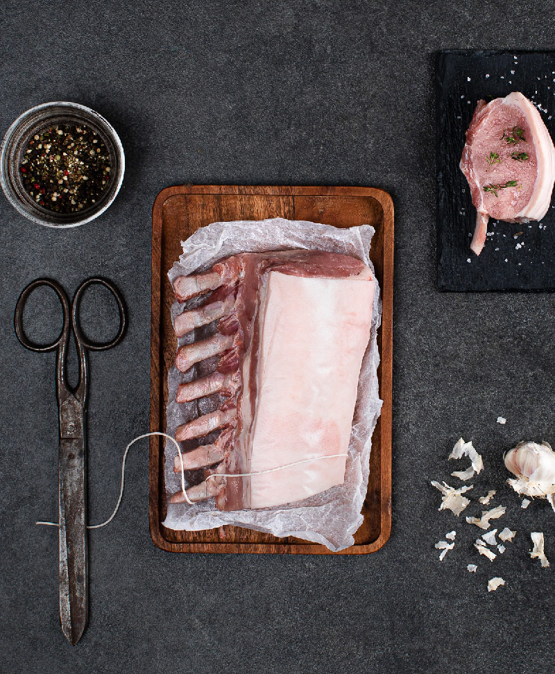 Pork Rack (rind on). A show stopping pork dish for a great Sunday lunch or special occasions, sure to impress any crowd. Juicy and tender, a delightful crackle sits atop and can be sliced into mouth-watering cutlets.